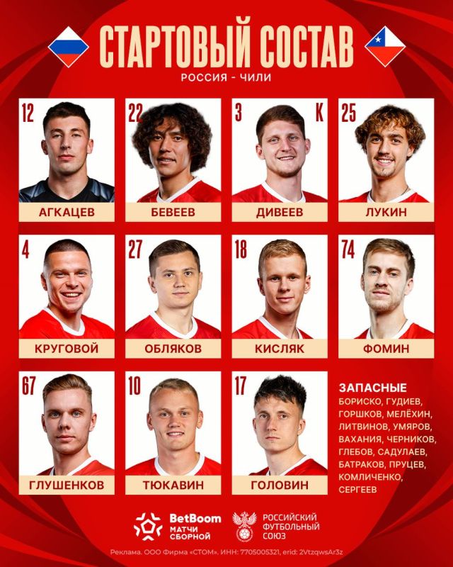 На поле с первых минут выйдут Станислав Агкацев, Мингиян Бевеев, Игорь Дивеев, Матвей Лукин, Данил Круговой, Иван Обляков, Матвей Кисляк, Даниил Фомин, Максим Глушенков, Константин Тюкавин и Александр Головин.Капитаном в этой игре будет Дивеев...