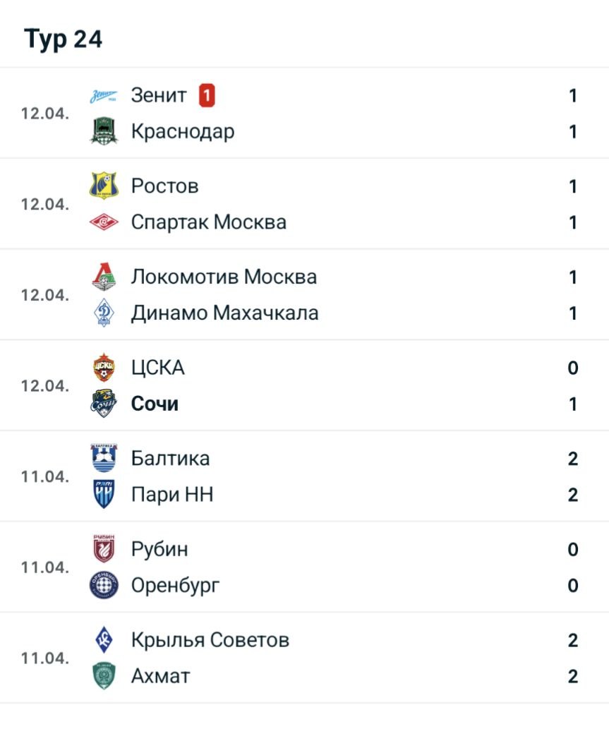 Коротко о 24-и туре РПЛ. Торжество мира! Победил только занимающий последнее место "Сочи".Завтра пройдет последний матч тура "Акрон" - "Динамо" (Москва). Будет ничья?